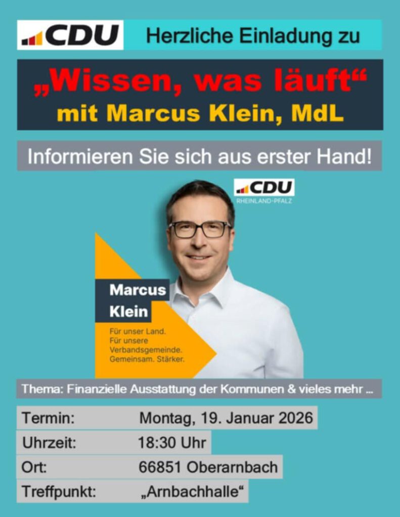 Im Rahmen seiner Veranstaltungsreihe „Wissen, was läuft“ mit Marcus lädt Marcus Klein, Landtagsabgeordneter und Parlamentarischer Geschäftsführer der CDU-Landtagsfraktion, die Bürgerinnen und Bürger herzlich zu einem Dialog- und Informationsabend ein. Die Veranstaltung findet am Montag, den 19. Januar, um 18:30 Uhr in der Arnbachhalle statt.